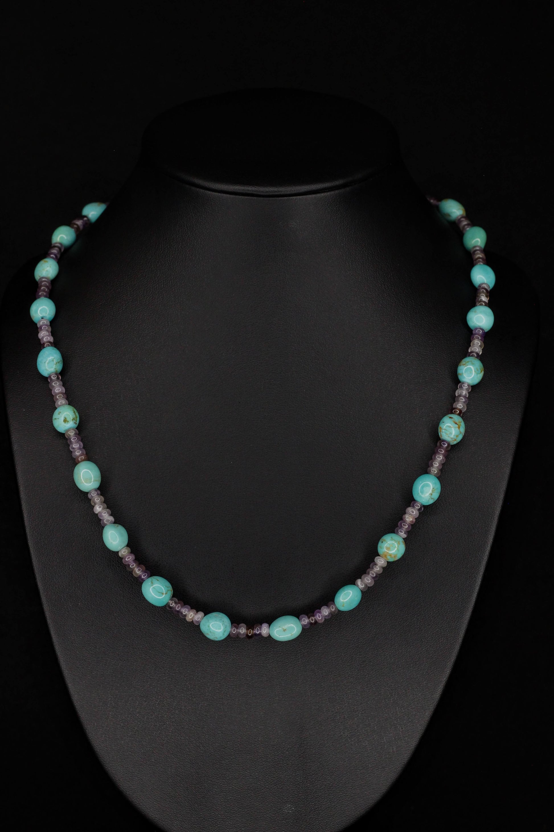 Darlene’s touch shows in the spacing — each turquoise stone given room to stand on its own, with the amethyst creating a steady rhythm in between. It gives the piece a clean, balanced feel that lays easily and naturally.