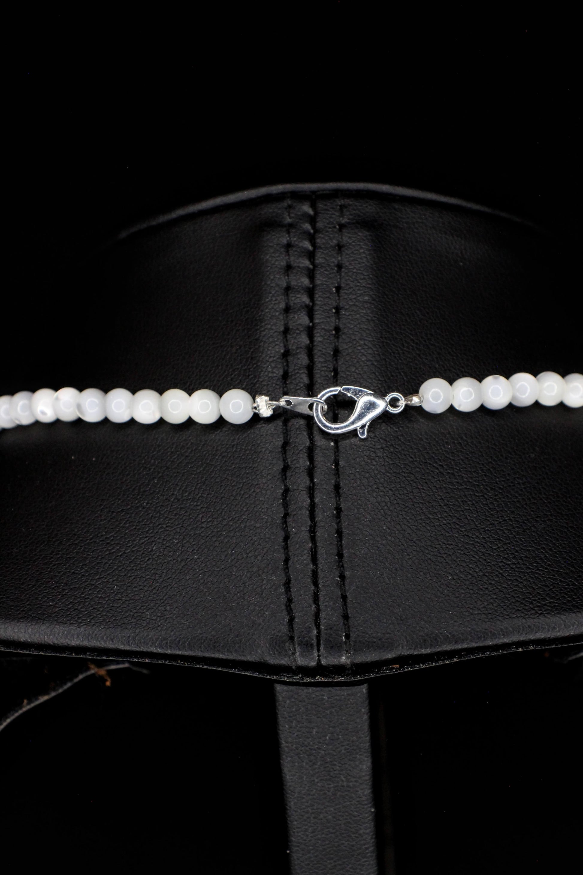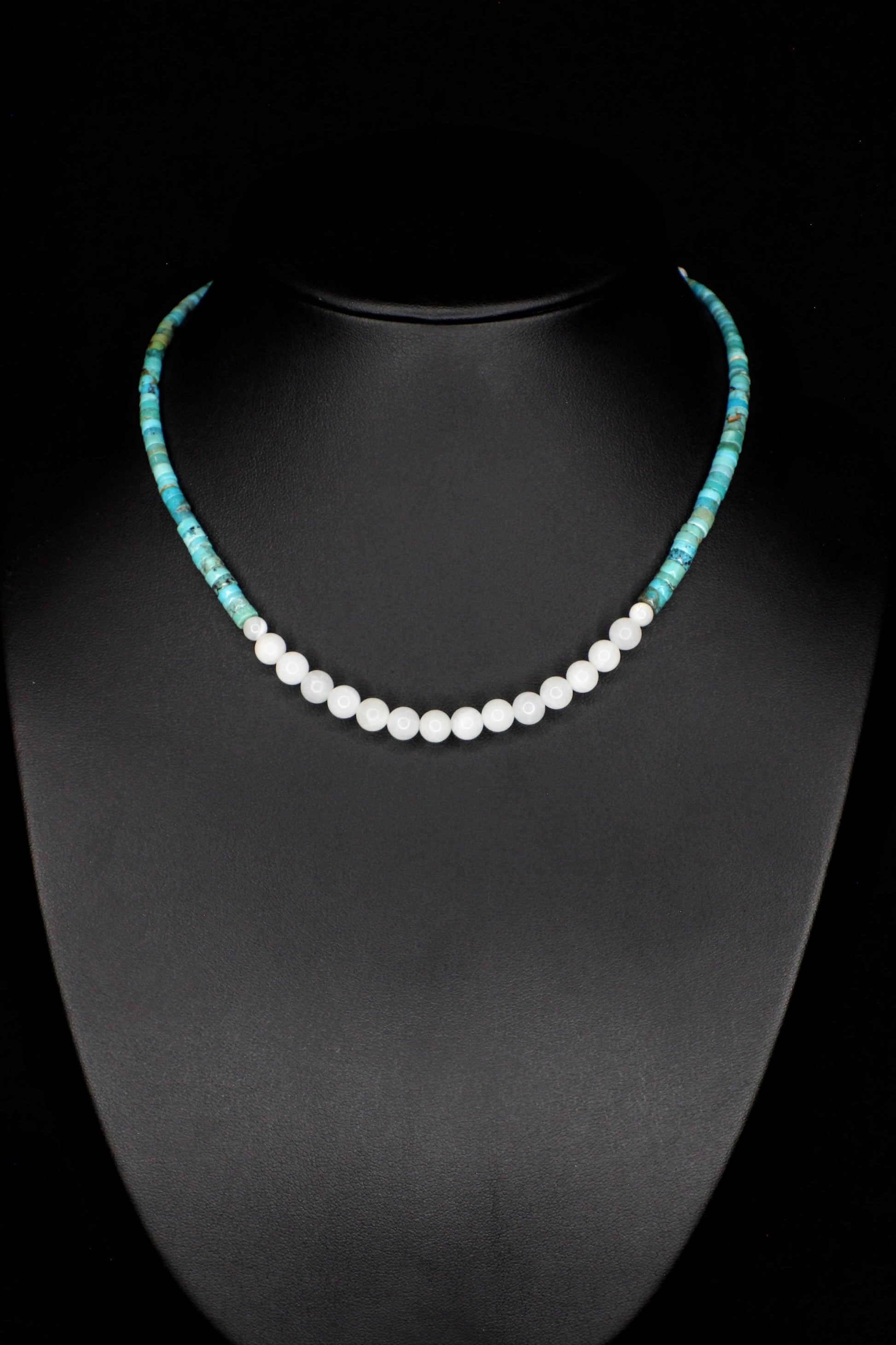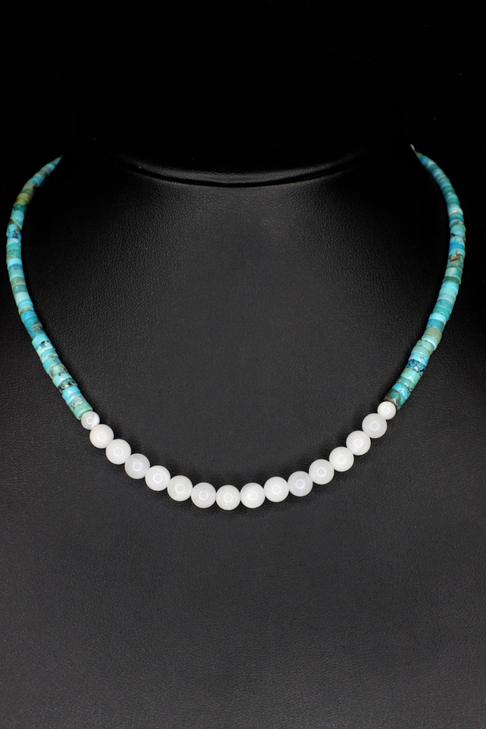 A clean line of luminous mother of pearl beads forms the center of this piece, framed by tapered turquoise that softens outward along the neckline. The glow of the shell catches the light with every movement, while the turquoise carries the natural blues and greens that connect us to our origins.