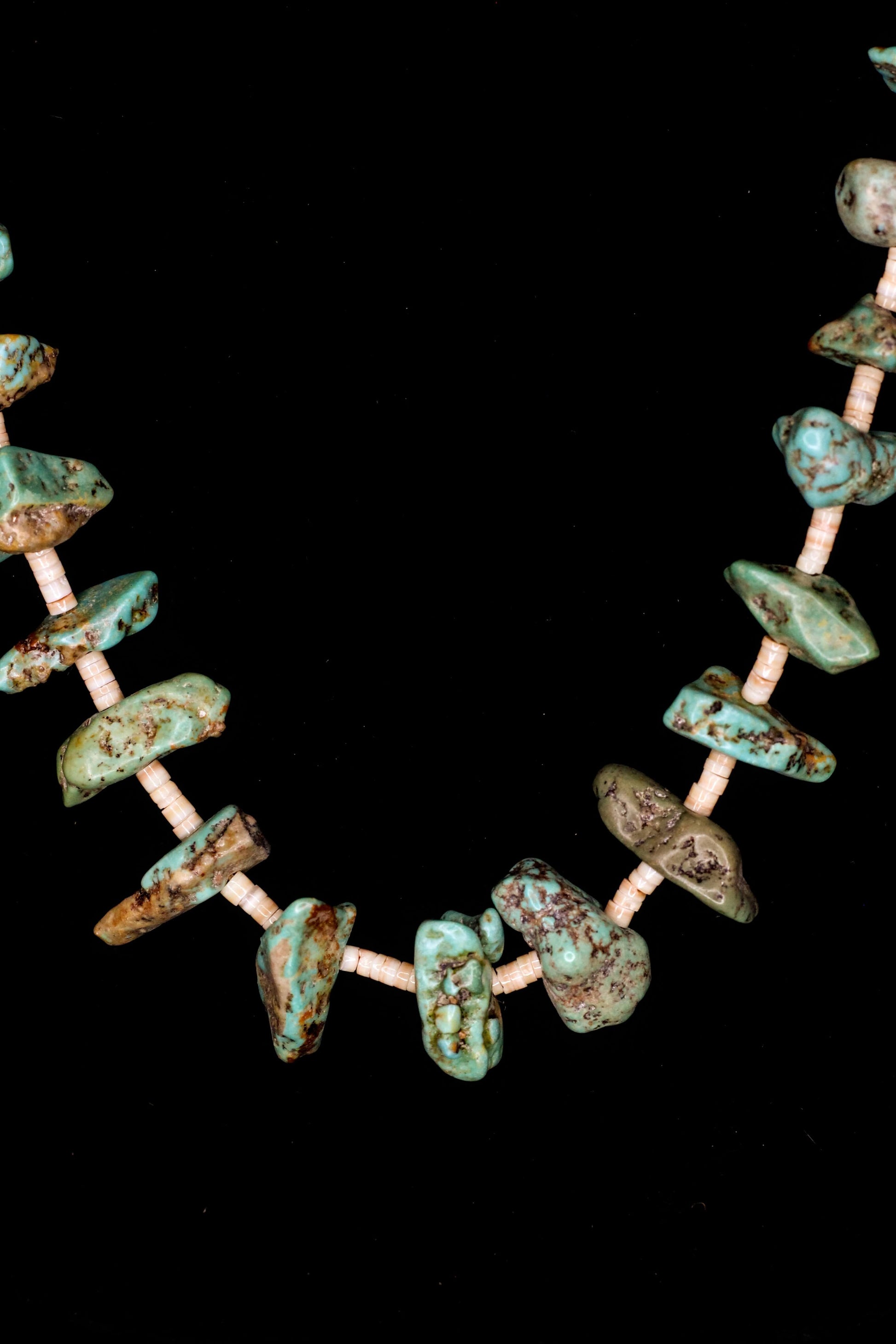 The melon shell heishi brings balance and structure without taking attention away from the turquoise. It keeps everything clean and lets the stones stand out.