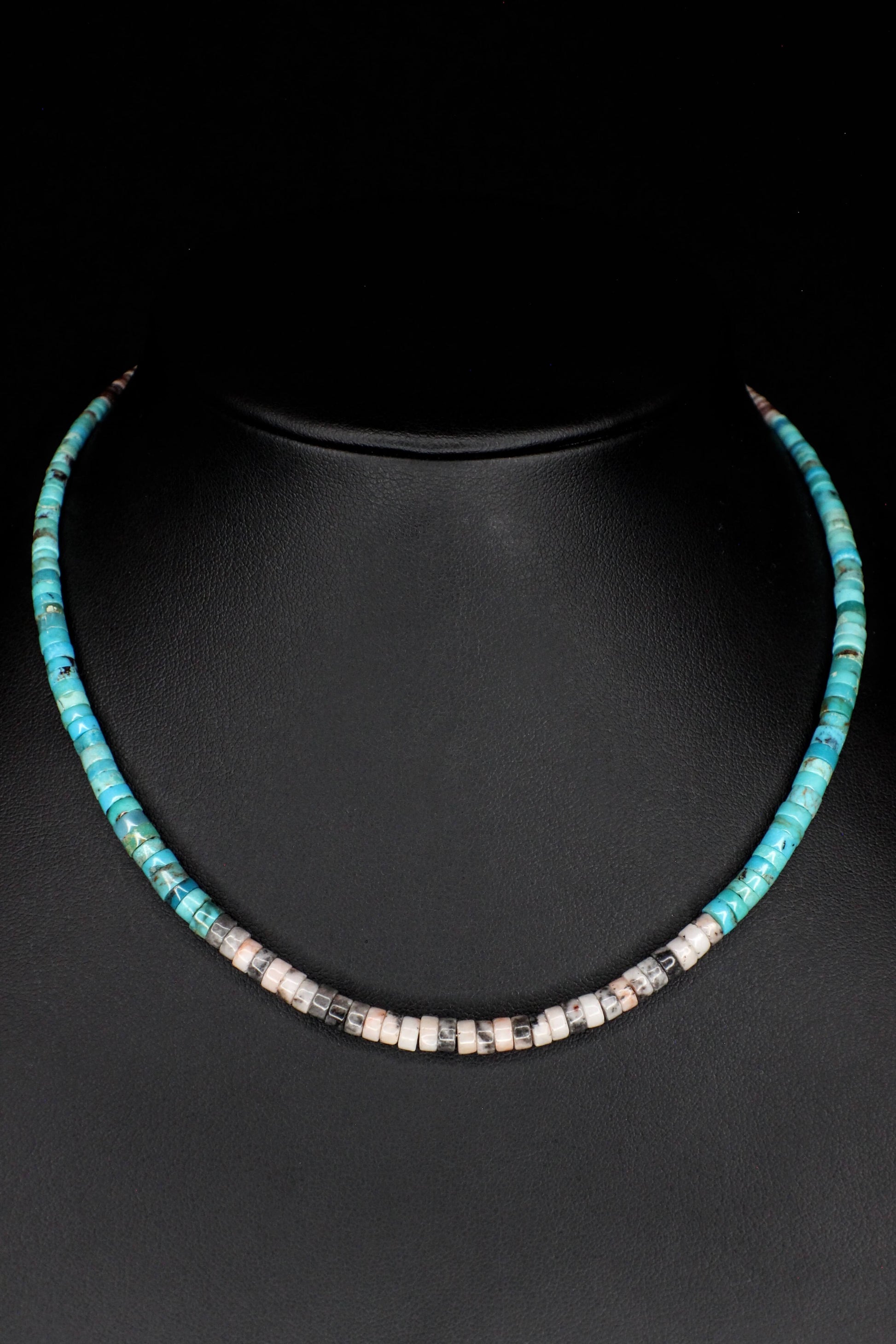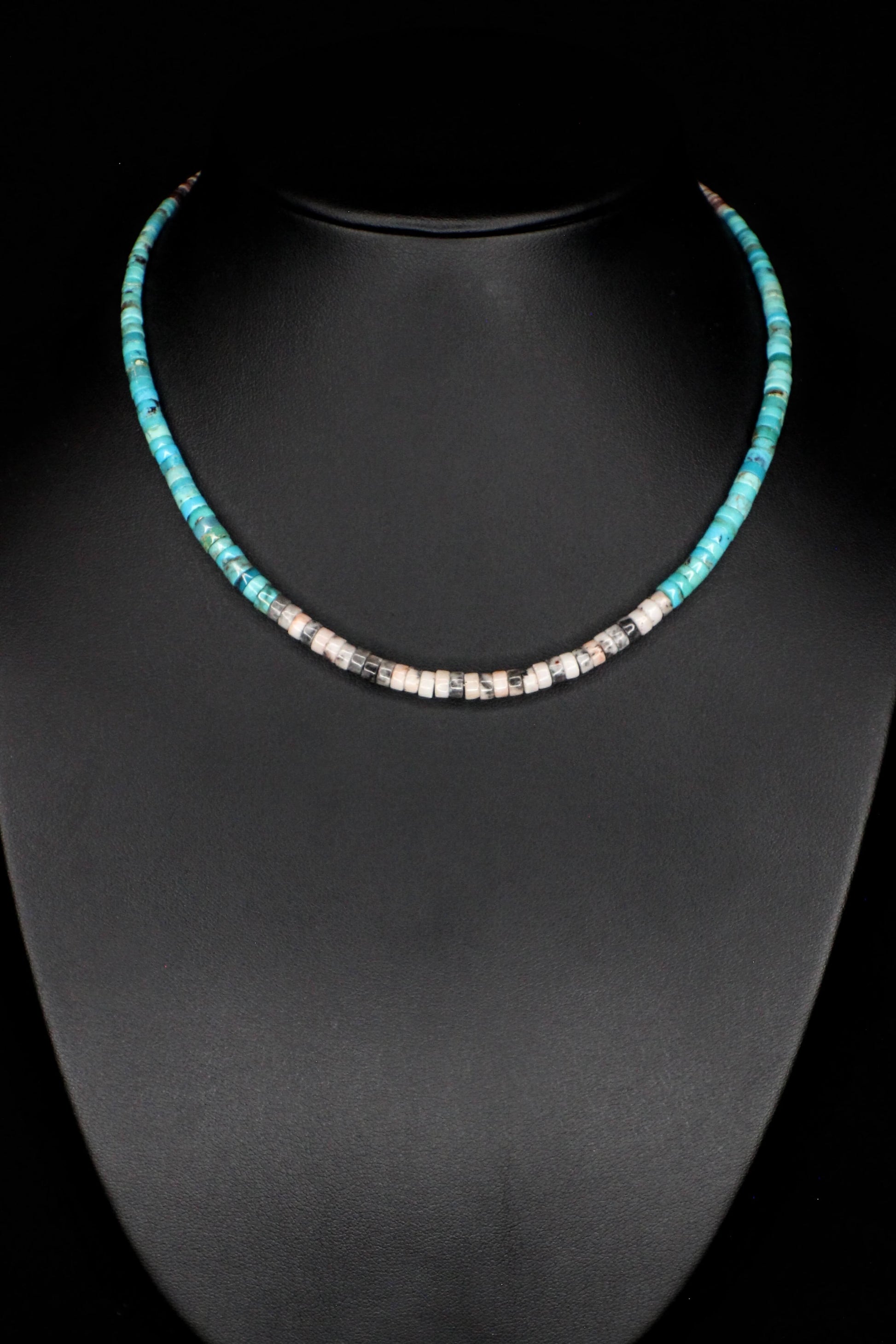 Working with turquoise, sterling silver, shell, and glass beads, Darlene carefully selects and arranges each element by hand, allowing color, balance, and natural beauty to guide every design. Her pieces are not mass-produced — each necklace is individually made, reflecting the quiet skill and steady hands of an artist who has spent a lifetime perfecting her craft.